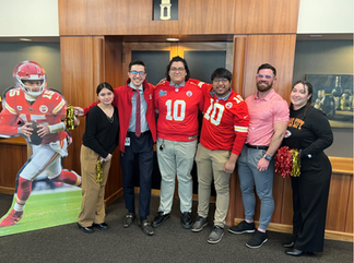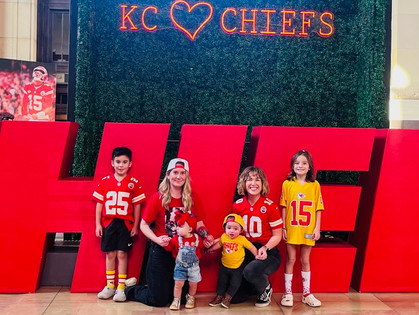 Eighth Row: Megan Piper with Tater from Q104Ā | Chiefs Kingdom = Family (Natalie, Ariel, River, Porter, Arlo & Wells)
