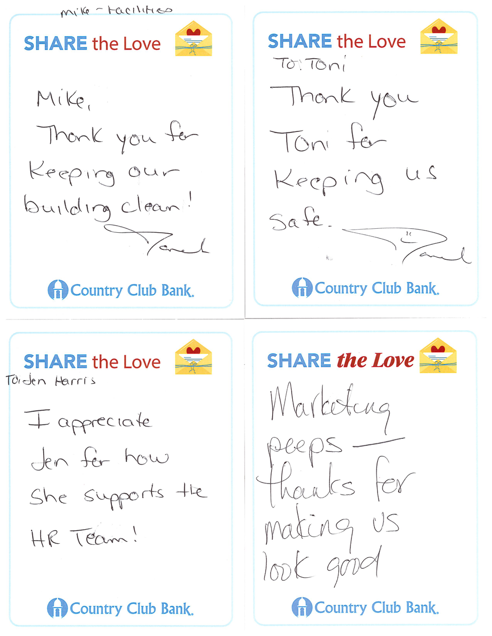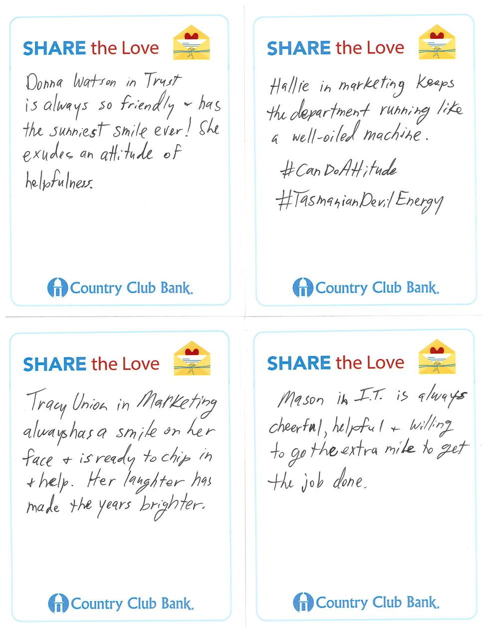 For Random Acts of Kindness Day on February 17, CCB associates were encouraged to write a quick note of appreciation for team members who help make their jobs better and days brighter. It’s obvious from the notes below that we have lots of very thoughtful, positive and helpful associates at Country Club Bank!