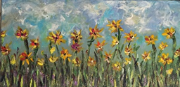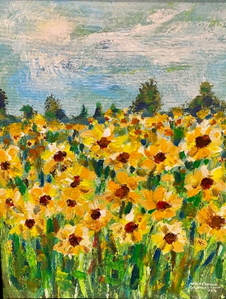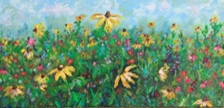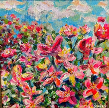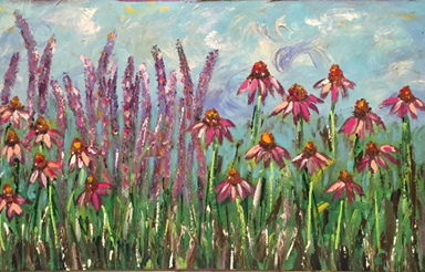 Her primary medium is acrylic, although she also relies on other media and textures. The bright colors in her paintings and drawings reflect nature's abundant color palette.