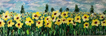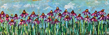 As she paints, she says she finds herself quieted by the light and the shadows the setting sun casts upon the tops of the trees. Or, she may be captivated watching a morning glory open before noon. It is in those moments she feels grounded, and energy passes through the paint.